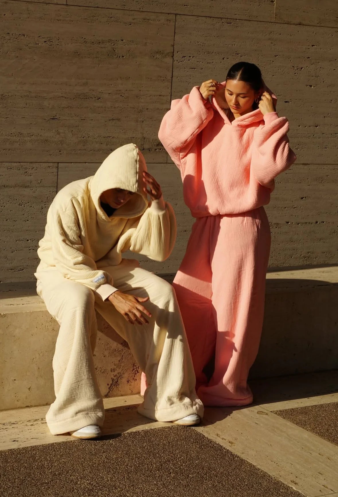 sherpa interior meets soft bubble-gauze shell. We designed it to feel like a blanket, styled to move beyond the couch.